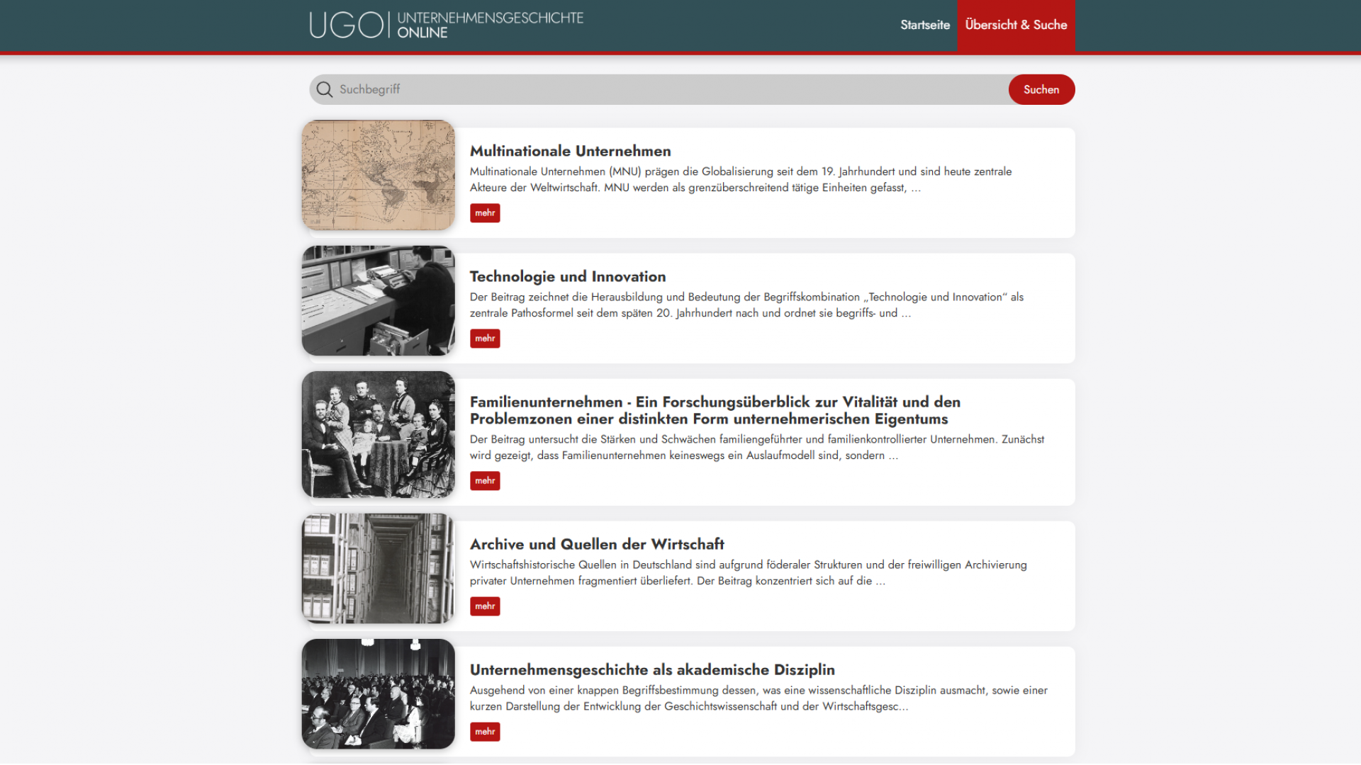 Dieses virtuelle Handbuch der Unternehmensgeschichte wird von Fachkolleg:innen erstellt und bietet ein frei zugängliches, kontinuierlich wachsendes Nachschlagewerk zur Unternehmensgeschichte, das verlässlich ist und die aktuelle Forschung bündelt. Es richtet sich an alle, die sich wissenschaftlich, beruflich oder privat mit Unternehmensgeschichte beschäftigen – und schafft erstmals eine zentrale, digitale Anlaufstelle für das Fach.